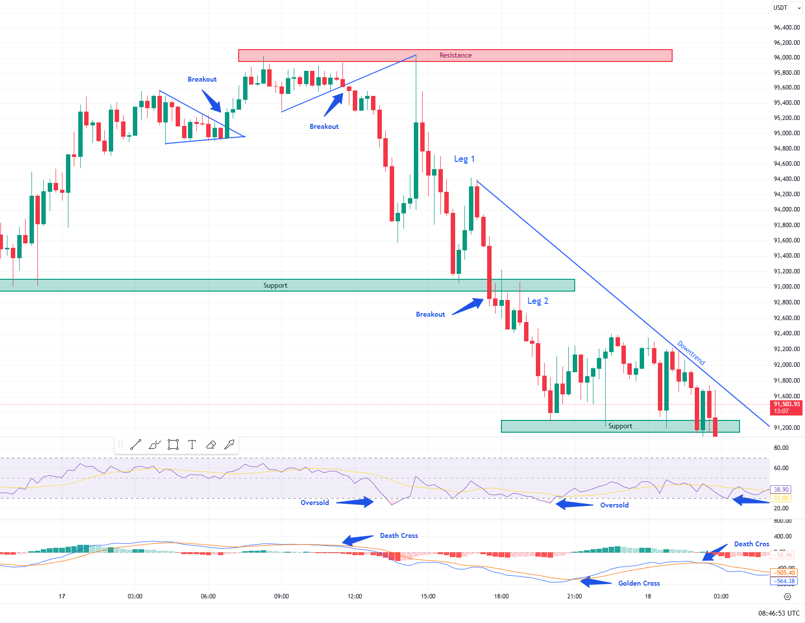 After the rejection, the Bitcoin price dropped back toward $93,000, drifting down within the existing trading range almost magnetically. The range eventually snapped to the downside with a full-body bearish candle at 17:30 UTC, which triggered the next leg of the decline. BTC fell lower until it marked the second leg of the downward spike at the support region around $91,300.
