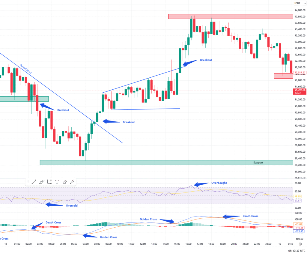 A second golden cross printed on the MACD at 14:45 UTC further increased the buying pressure in the market, with the Bitcoin price surging high enough to break out of the extending channel at 15:15 UTC. This leg to the upside carried BTC to the daily high of $93,800, right in a key resistance zone. At this point, Bitcoin entered an overbought RSI condition, and the MACD printed a second crossover at 18:30 UTC to confirm the next move lower as the market readied itself for another corrective leg.